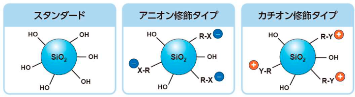 合成工程や原料を精密に制御することにより粒径の均一性が極めて高く、粒子の凝集が高度に抑制されたコロイダルシリカを製造可能としています。平均粒径だけでなく真球状シリカから数個のシリカ粒子が結合するなど会合度の調整が可能です。