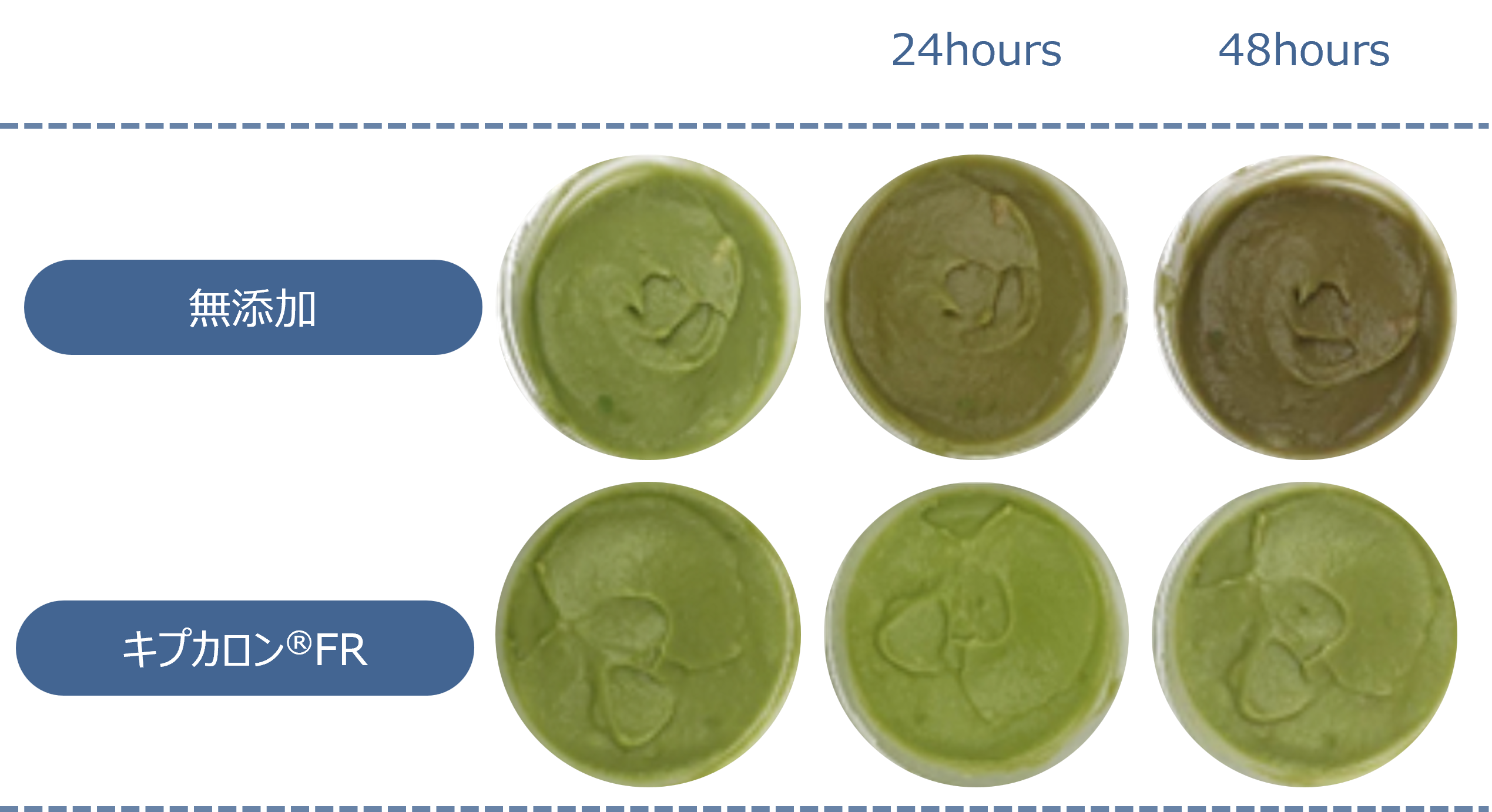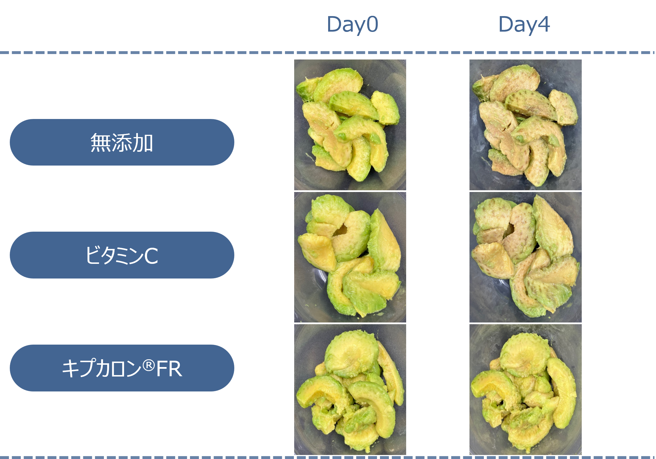 解凍時から褐変褐変しやすい冷凍カットアボカドにおいても、高い変色防止効果を発揮しました。