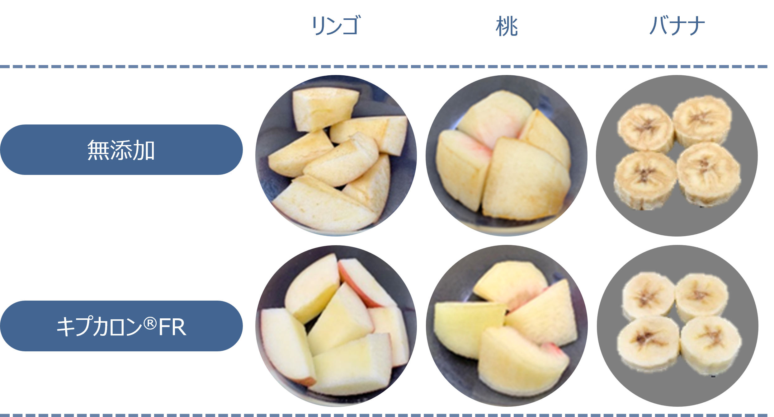 カットフルーツを「キプカロン®FR」で浸漬することにより、高い変色防止効果が確認されました。