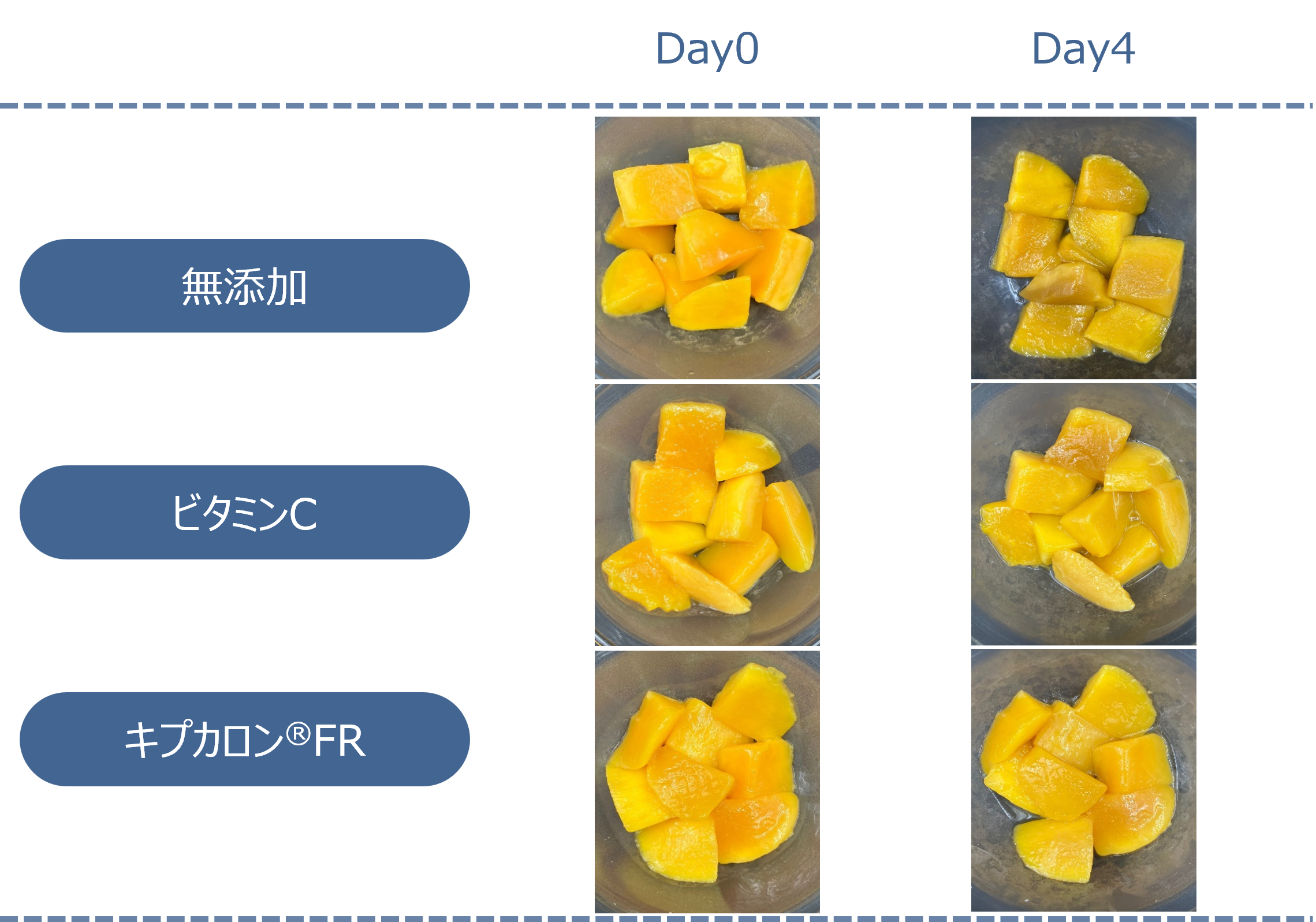 解凍時から褐変褐変しやすい冷凍カットマンゴーにおいても、高い変色防止効果を発揮しました。