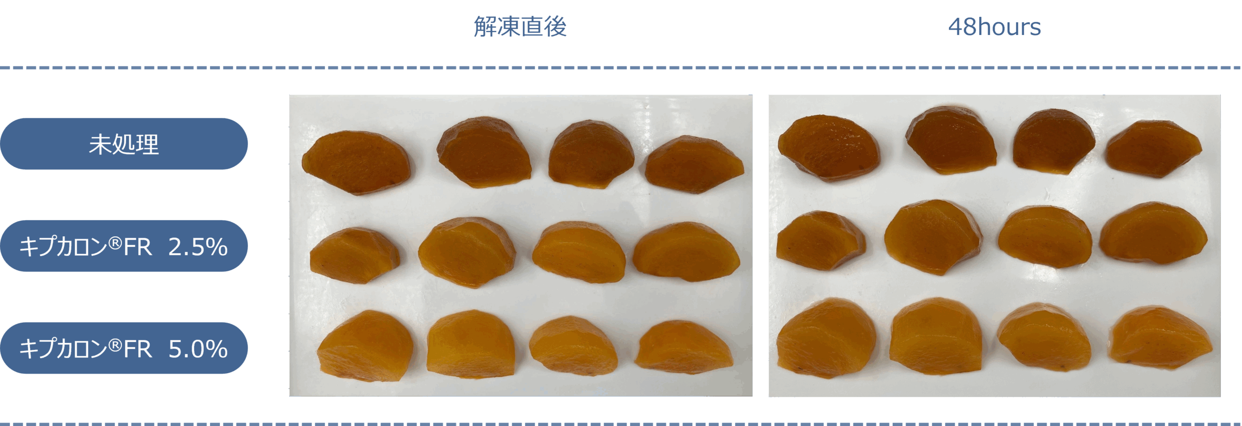 「キプカロン®FR」で浸漬することにより、長期間の冷凍後も高い変色防止効果が確認されました。