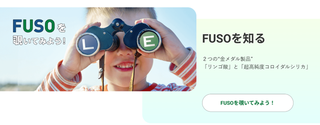 「FUSOを覗いてみよう!」に鹿島事業所の新たな写真や、両事業部の最新情報を追加いたしました。 当コンテンツでは、「リンゴ酸」と「超高純度コロイダルシリカ」という「金メダル製品」を通じて、当社の事業内容を詳しく知っていただくことができます。 ぜひ、トップページのバナー、または以下の画像よりご覧ください。