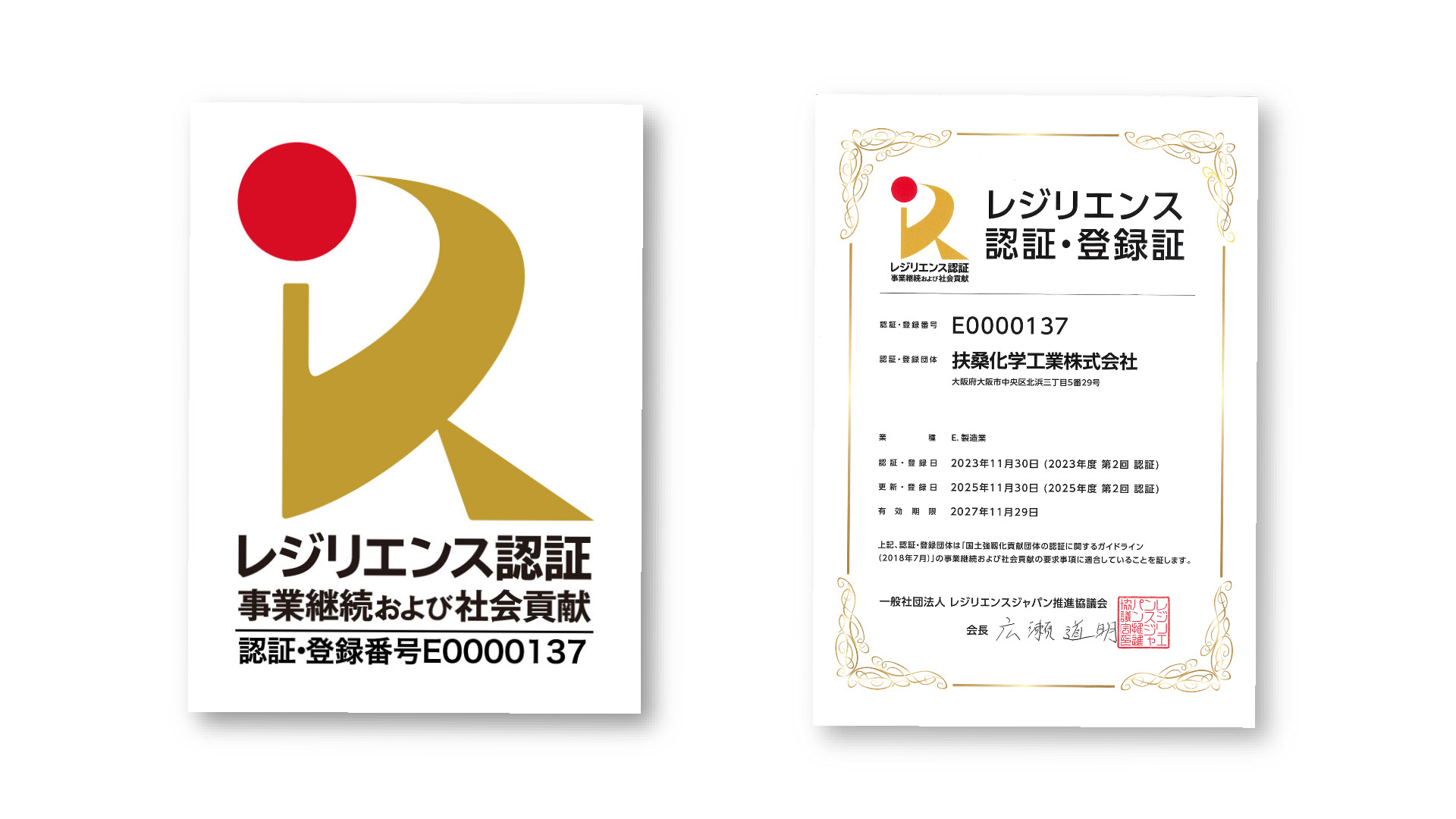扶桑化学工業株式会社は、2023年に取得いたしました「国土強靭化貢献団体認証(レジリエンス認証)」