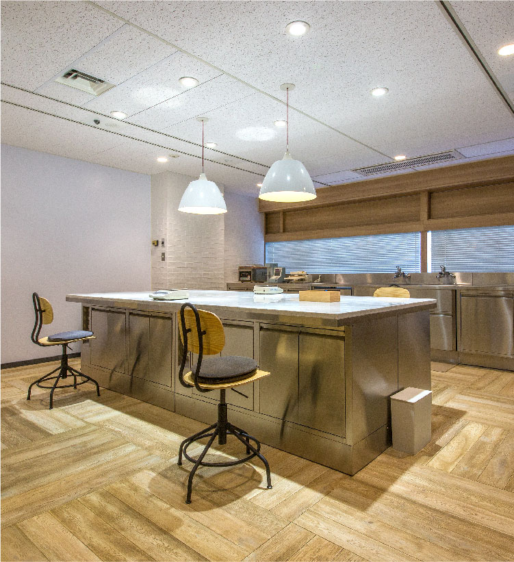 これまで培ってきた「超高純度コロイダルシリカ」関連の技術を生かし、半導体研磨分野以外への製品の研究開発を目的として設立された東京研究所。電子材料事業の新規開発拠点としての機能を有し、2017年には、ライフサイエンス事業の研究施設として「テストキッチン」を開設。レストランの厨房のような業務用調理機器をそろえ、食品の加工方法や品質改良剤、調味料など食品関連の研究開発を行っています。