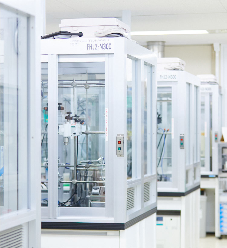 電子材料事業の主要な研究開発拠点である神戸研究所。主に半導体製造の研磨工程に欠かせない「超高純度コロイダルシリカ」に関する研究開発を行っています。「純度」や「ナノレベル粒子制御」といった他社の追随を許さない技術力を以て半導体の微細化や高集積化を支えています。